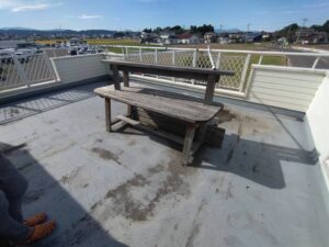 H様邸のバルコニーは、とても広く日当たり抜群ですが、施工前は床の劣化が目立ちました。テーブルセットと植木の撤去行い、しっかり改修を行い広々と気持ちのいいバルコニーになりました。