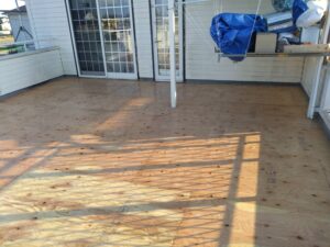 H様邸のバルコニーは、とても広く日当たり抜群ですが、施工前は床の劣化が目立ちました。テーブルセットと植木の撤去行い、しっかり改修を行い広々と気持ちのいいバルコニーになりました。