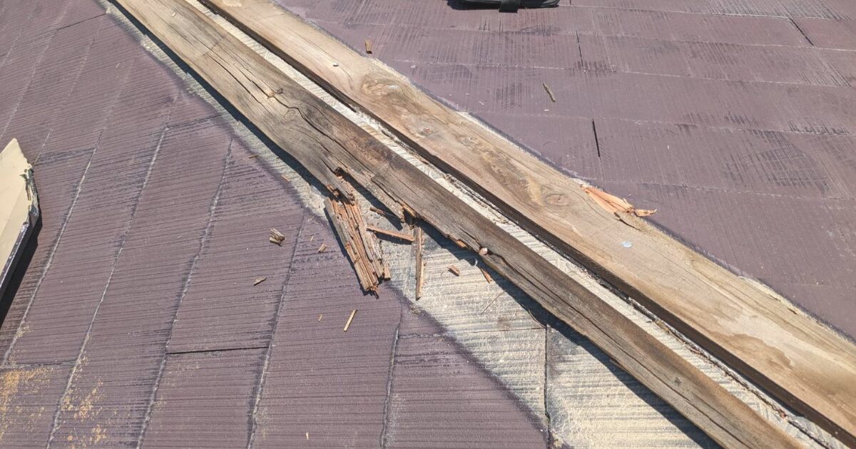 近くで見ると、屋根材は欠けが多く、棟板金を撤去すると中の貫板が腐食していました。