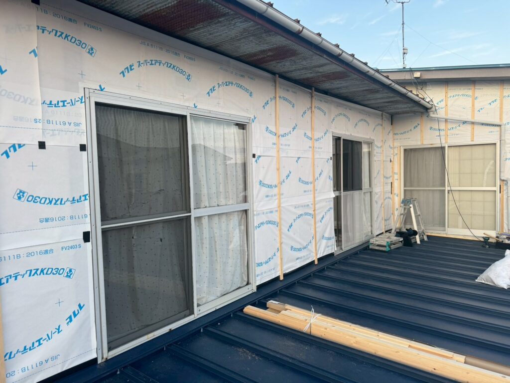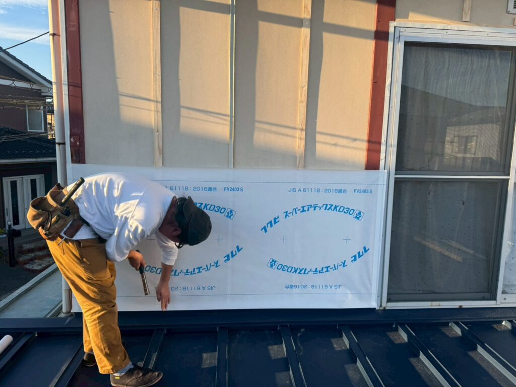 ■透湿防水シートを貼っていきます。このシートを貼る事で、外部からの水、冷気の侵入を遮断し、内部の湿気を排出することを助けます。