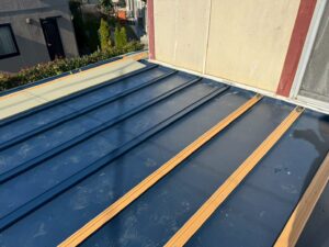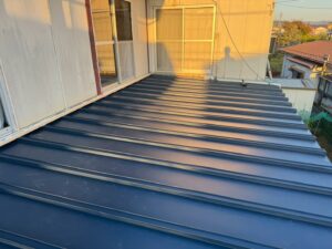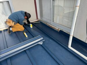 現在、オリガミルーフが施工を承っている《石巻市のS様邸》をご覧ください。前回、大部分の屋根材を設置していきました。今回は、凸っている部分に板金を設置していく様子と外壁と屋根の境目をカバーしていく様子になります。