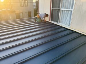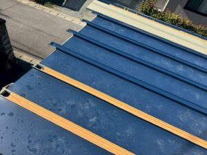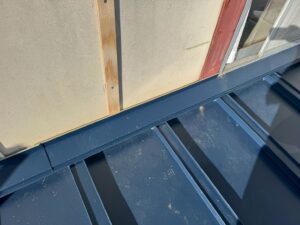 現在、オリガミルーフが施工を承っている《石巻市のS様邸》をご覧ください。前回、大部分の屋根材を設置していきました。今回は、凸っている部分に板金を設置していく様子と外壁と屋根の境目をカバーしていく様子になります。
