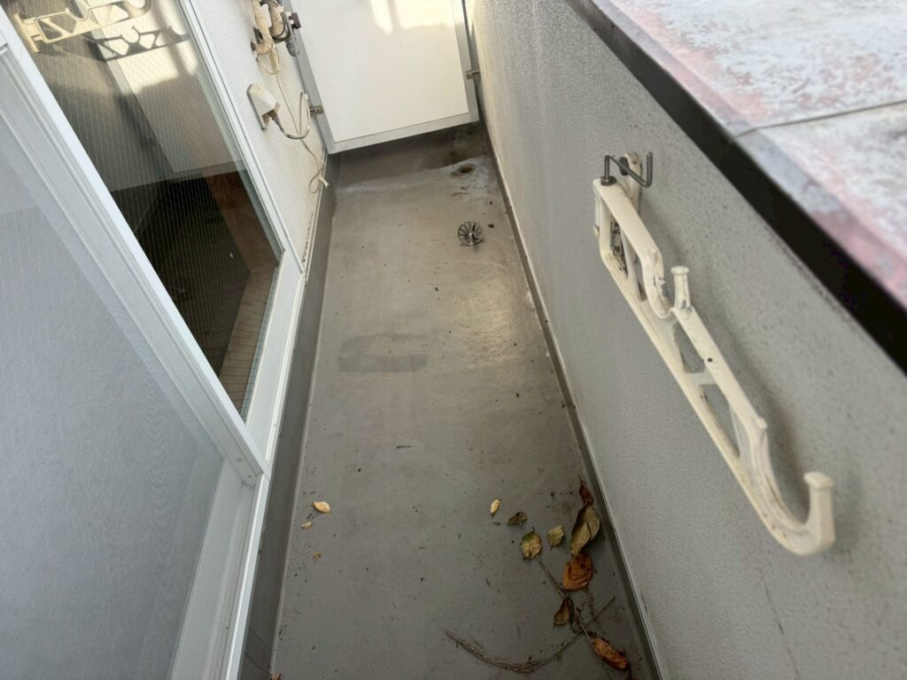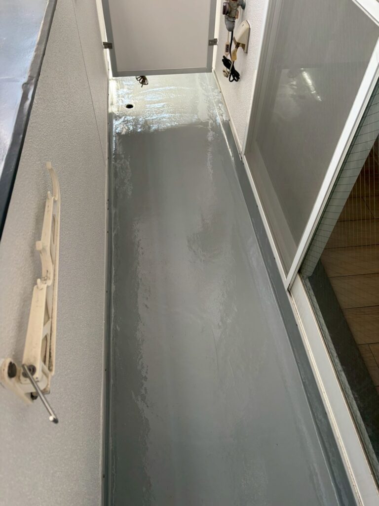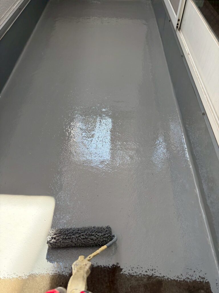 今回の現場でも、ベランダの防水塗装を行いました。