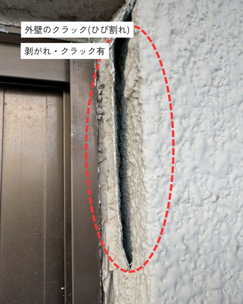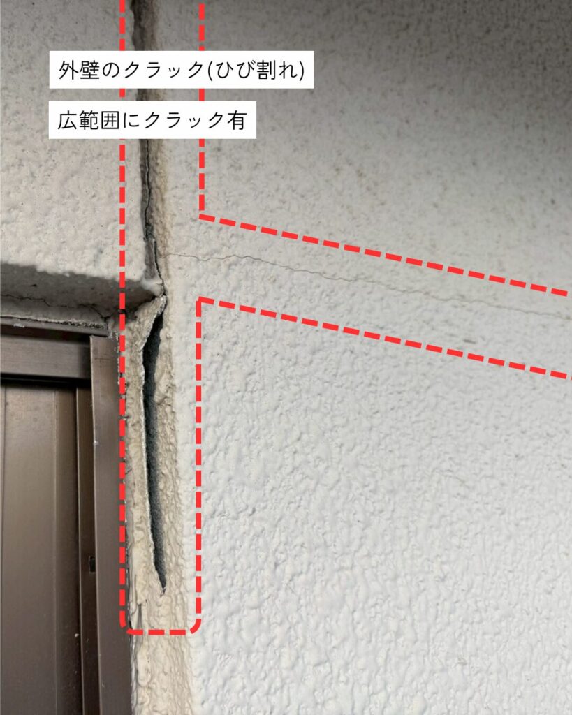 横方向に走るひび: 縦のひびよりも雨水が溜まりやすく、内部に水が入り込みやすい性質があります。写真は先程と同じ箇所の写真になりますが、横方向にもクラックが走っていることが確認できます。