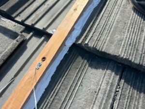 ■棟の内部の木材を交換します。交換後に、針金とコーキング材で棟のズレの補修・固定を行っていきます。