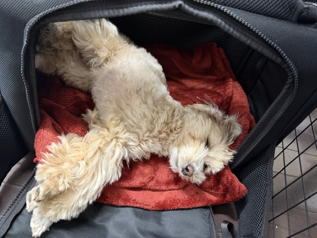 仕事中の愛犬です。私がお仕事をしている時は、基本的に足元でずっと寝ております。