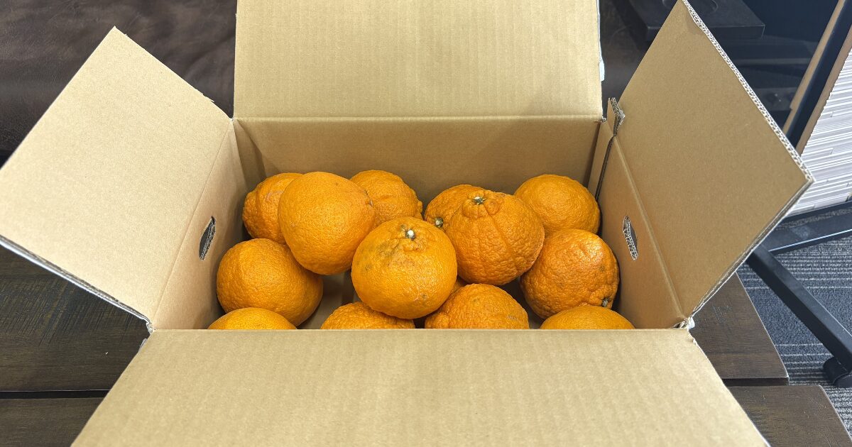 デコポンです。「不知火(しらぬい)」という品種で、「清見」×「ポンカン」の交配品種だそうです。