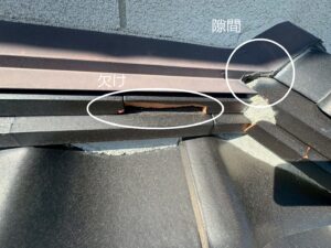 瓦の割れ、谷板金の錆、瓦のズレ、漆喰劣化による隙間、穴の発生などがあります。