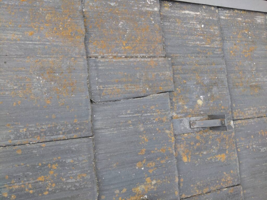 スレートのひび割れ・反り: 塗装が剥げたスレートが水分を吸い、乾燥と湿潤を繰り返すことで反りやひび割れが発生し、隙間から浸水します。