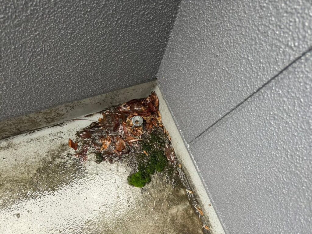 排水口(ドレン)の詰まり: 落ち葉やゴミで排水口が詰まると、ベランダがプールのようになり、サッシの隙間など本来想定していない場所から水が溢れ出します。